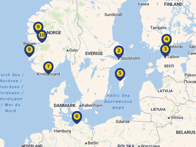 Poznejte místa, kde Vaše loď během plavby zakotví! Každá zastávka je označena číslem, které odpovídá její pozici na mapě, abyste mohli snadno sledovat celou trasu. Stačí kliknout na vybranou destinaci a zjistíte více o každé z nich. Pro lepší přehled si můžete celý program plavby prohlédnout přímo na mapě.