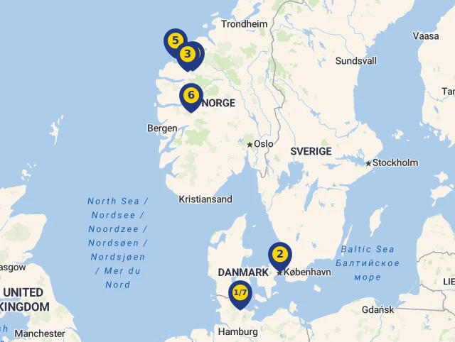 Poznejte místa, kde Vaše loď během plavby zakotví! Každá zastávka je označena číslem, které odpovídá její pozici na mapě, abyste mohli snadno sledovat celou trasu. Stačí kliknout na vybranou destinaci a zjistíte více o každé z nich. Pro lepší přehled si můžete celý program plavby prohlédnout přímo na mapě.