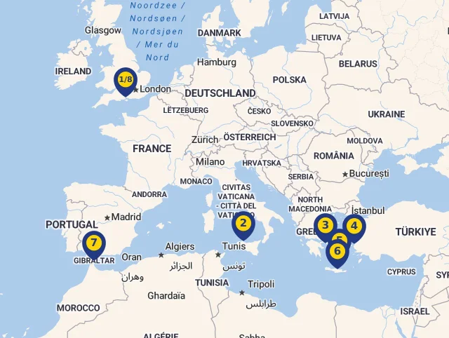 Poznejte místa, kde Vaše loď během plavby zakotví! Každá zastávka je označena číslem, které odpovídá její pozici na mapě, abyste mohli snadno sledovat celou trasu. Stačí kliknout na vybranou destinaci a zjistíte více o každé z nich. Pro lepší přehled si můžete celý program plavby prohlédnout přímo na mapě.
