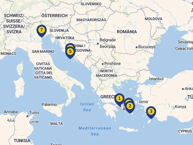 Poznejte místa, kde Vaše loď během plavby zakotví! Každá zastávka je označena číslem, které odpovídá její pozici na mapě, abyste mohli snadno sledovat celou trasu. Stačí kliknout na vybranou destinaci a zjistíte více o každé z nich. Pro lepší přehled si můžete celý program plavby prohlédnout přímo na mapě.