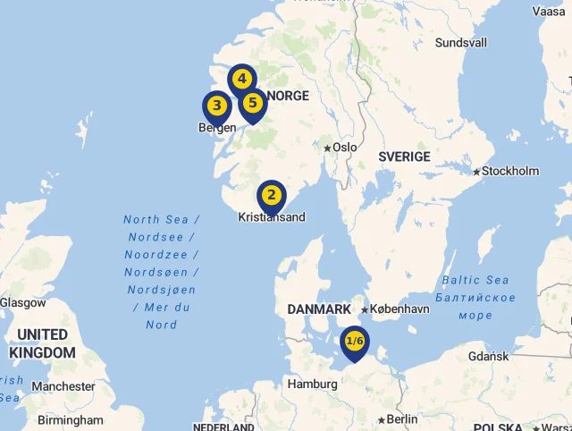 Poznejte místa, kde Vaše loď během plavby zakotví! Každá zastávka je označena číslem, které odpovídá její pozici na mapě, abyste mohli snadno sledovat celou trasu. Stačí kliknout na vybranou destinaci a zjistíte více o každé z nich. Pro lepší přehled si můžete celý program plavby prohlédnout přímo na mapě.