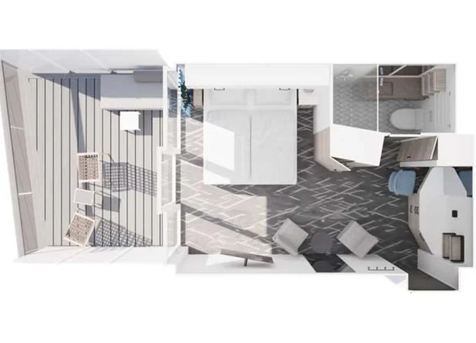 | VEKO - Kajuta s terasou 20 m² + balkon 13 m² se židlemi a váľandou. 15. paluba. Max 2 osoby. | 84 700 Kč 84 700 Kč za osobu |