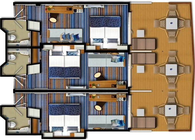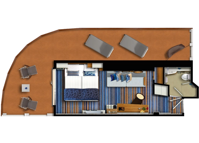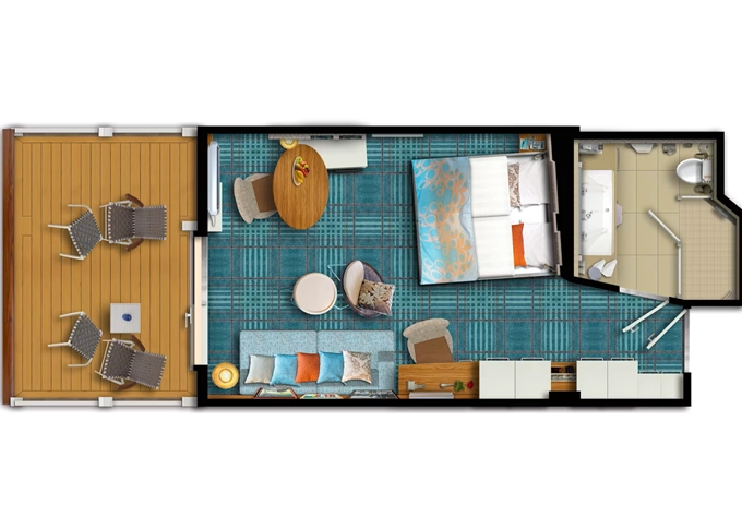 | VEPO - Kajuta s terasou Premium 17 m² + balkon 30 m² s 2 kreslami, 2 lehátky a houpací sítí. 7-11. paluba. Max 3 osoby. | 279 447 Kč 279 447 Kč za osobu | ||