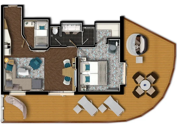 | SUDO - Diamant Suite 42 m² + balkon 47 m² se stolem se 4 židlemi, s houpací sítí, 2 lehátky a postelí Sun island. 2 ložnice, obývací pokoj, Herní konzole. 6. paluba. Max 6 osoby. Výhody Suite. | 578 428 Kč 144 607 Kč za osobu |