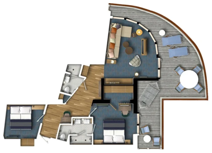 | SPNO - Panorama Suite 73-77 m² + balkon 31-36 m² se stolem, lehátky a houpací sítí. 2 ložnice a 2 koupelny. 6,9,10. paluba. Max 6 osoby. Výhody Suite. | 353 954 Kč 353 954 Kč za osobu | ||